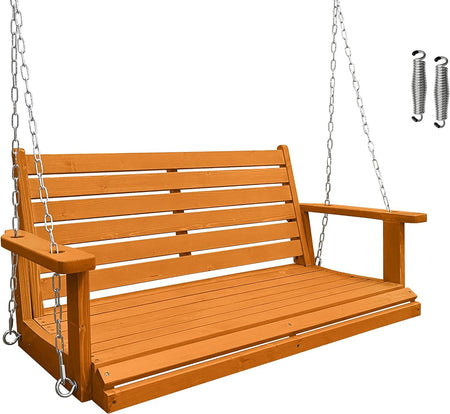 Wooden Porch Swing, Ergonomic Seat, Bench Swing with Hanging Chains and 7mm Springs, Heavy Duty 800 LBS, for Outdoor Patio Garden Yard (Amber Tone, 2-Seater)