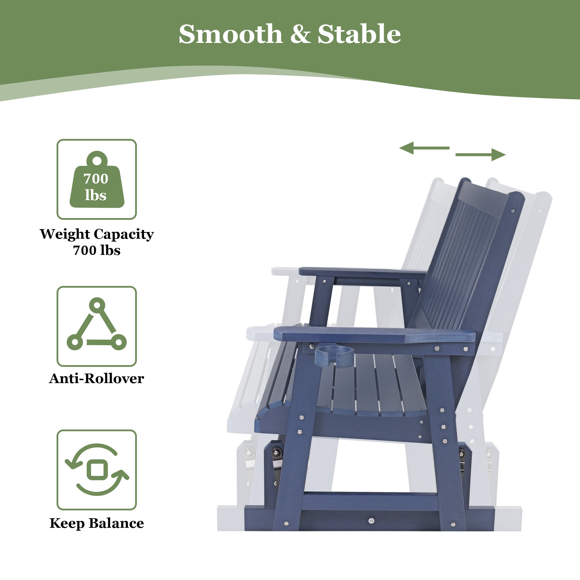 HIPS Patio Glider with Cup Holders, Durable Poly Lumber Material, All-Weather Resistant, High Backrest and Deep Contoured Seat, Heavy Duty 900 LB, for Outdoor, Porch, Patio (Navy Blue, 2-Seat)